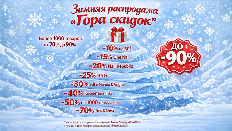 Скидка зависит от суммы заказа - чем больше заказ, тем больше скидка! А также акции, распродажа до 70% и подарки за каждый заказ!